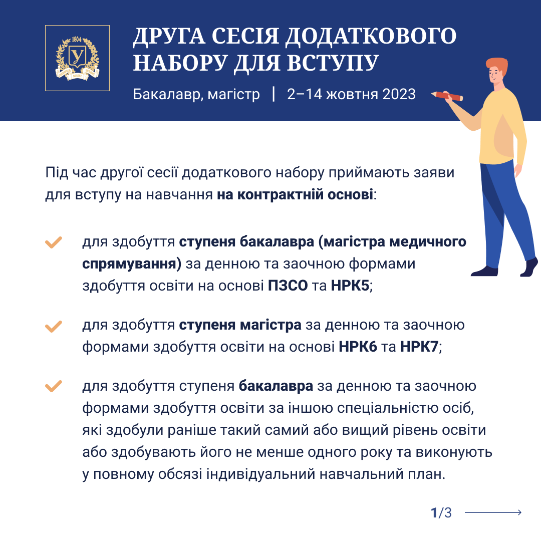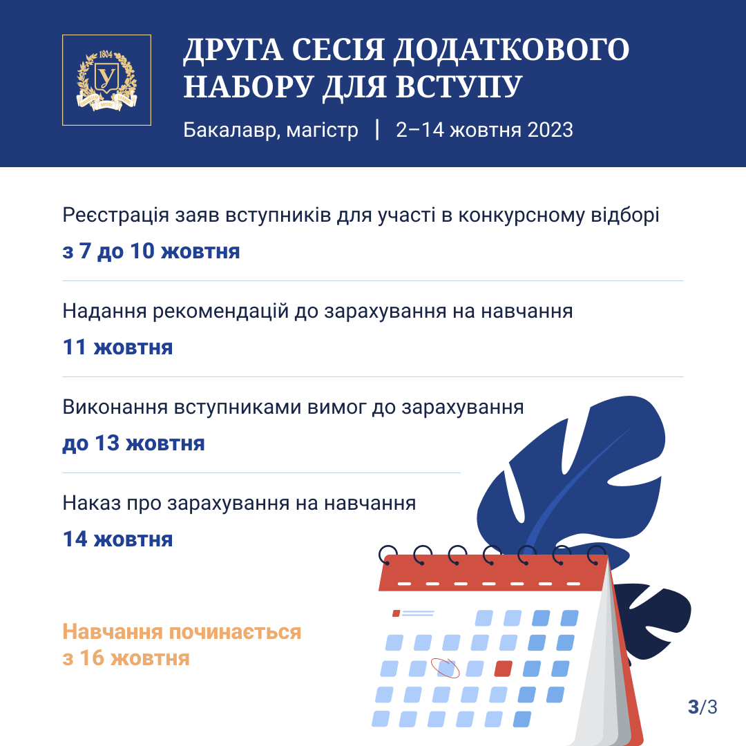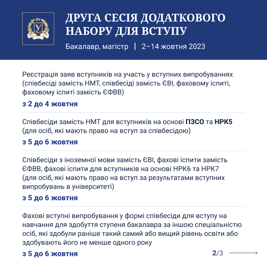 Друга сесія додаткового набору вступників триватиме 2–14 жовтня 2023 року. Всі дати зібрали для вас в інфографіці.